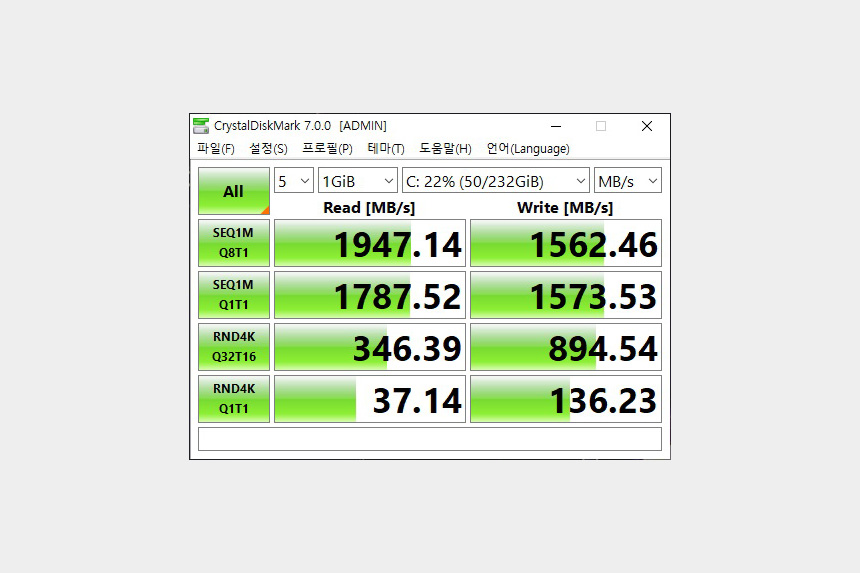 10세대 인텔 코어 i5-10210U 프로세서의 성능을 CPU-Z를 통해서 확인해보면 싱글 스레드는 461점, 멀티스레드는 1874점이 측정되었는데 무난한 편이라고 할 수 있습니다.