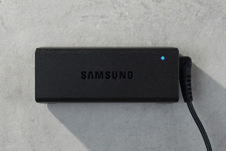 전원 케이블을 연결해서 사용하는 형태로 제작된 어댑터의 크기는 콤팩트한 편입니다. 그래서 노트북과 함께 휴대해도 크게 부담스러울 것 같지는 않습니다. 그리고 전원이 연결된 것을 알려주는 파란색 LED도 부착되어 있습니다.
