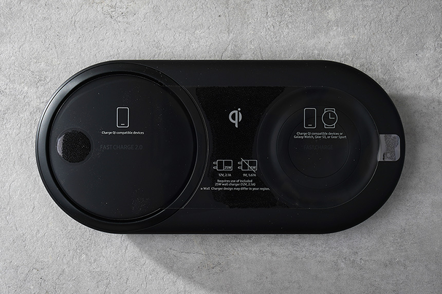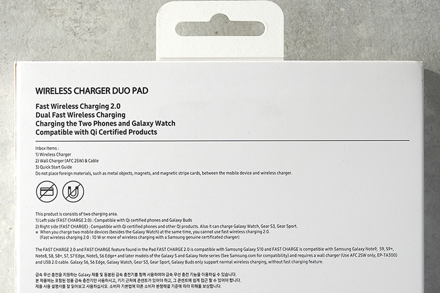 우선 삼성 무선충전패드 듀오(EP-P5200) 본체를 확인해보면 왼쪽에는 스마트폰 그리고 오른쪽에는 스마트워치 등의 제품을 충전하라는 문구가 표시되어 있습니다. 그리고 동봉된 25W 출력의 어댑터와 함께 사용하는 것을 권장한다고 합니다.