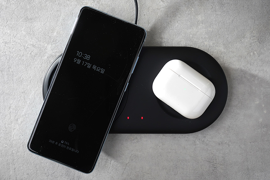 삼성 무선충전패드 듀오(EP-P5200)의 가장 큰 장점은 한 번에 두 개의 제품을 동시에 충전할 수 있다는 점입니다. 그리고 좌우 안착면의 충전 속도는 다르므로 가능하면 왼쪽을 활용해주는 것이 좋을 것 같습니다.