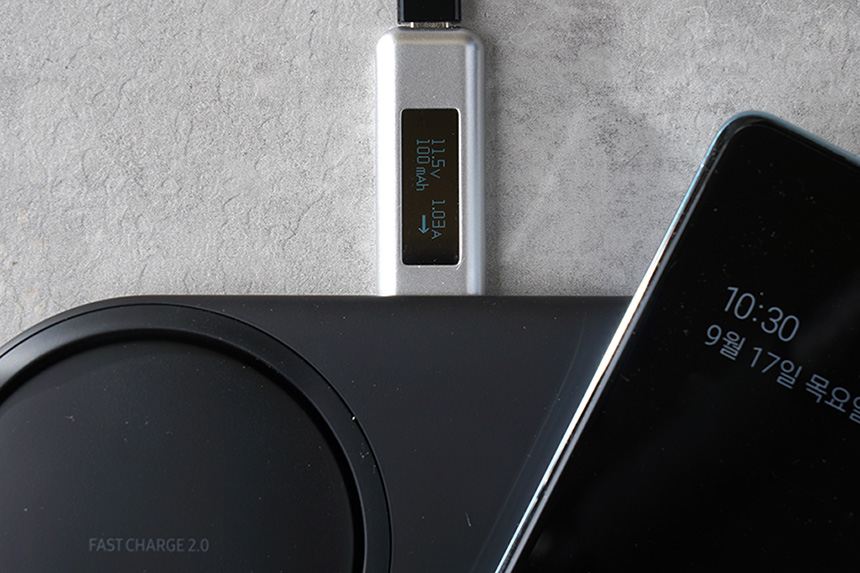 오른쪽 안착면 같은 경우에는 11.5V/1.03A로 약 11.8W로 충전이 되었습니다. 왼쪽에 비하면 약간 느리지만 그래도 이 정도라면 일반적으로 사용하는데 불편하지는 않을 것 같습니다. 그리고 두 대를 동시에 충전하면 출력이 더 떨어질 수 있습니다.