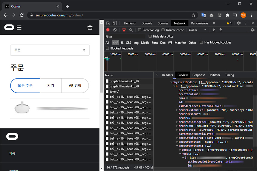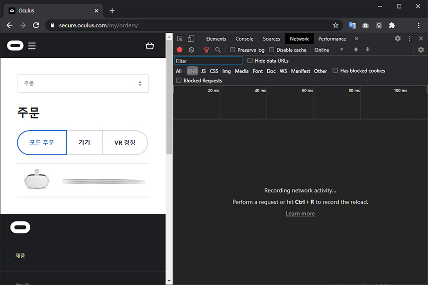 오큘러스 퀘스트2는 구매 단계에서 배송 날짜를 확인할 수 있지만, 주문 이후에는 내용을 확인하지 못해서 답답해하는 분들이 많습니다. 이럴 때는 우선 크롬으로 주문 페이지에 접속한 후에 F12 버튼을 누른 후에 위쪽에 있는 Network 탭을 클릭해주면 됩니다.