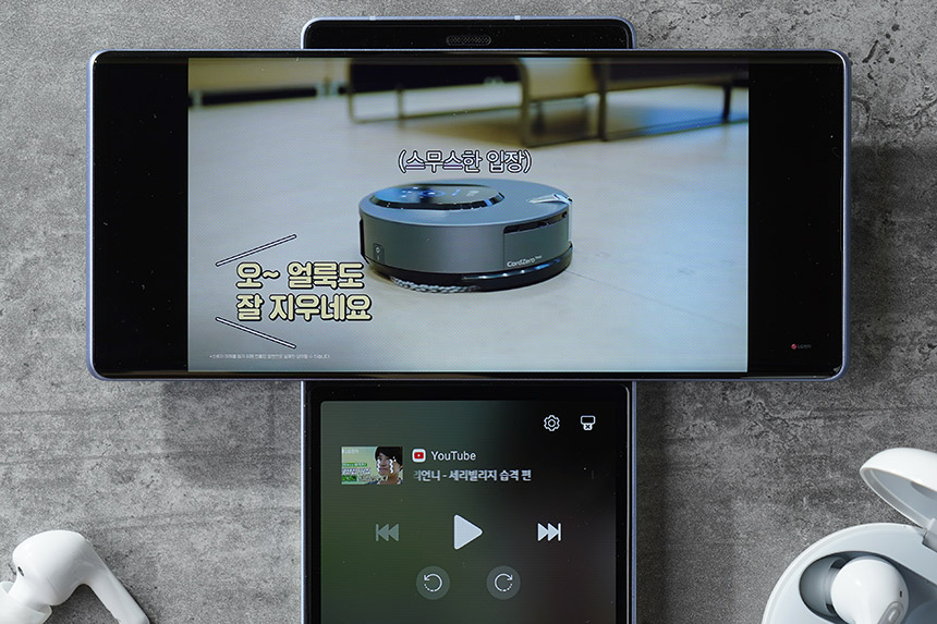 박모찌가 어지럽힌 거실을 물걸레 로봇 청소기 LG 코드제로 M9이 깨끗하게 청소하는 모습이 상당히 인상적이었습니다. 실제로 로봇 청소기를 사용하는 지인들의 의견을 들어보면 21세기 우렁각시와 같은 느낌을 받는다고 합니다.