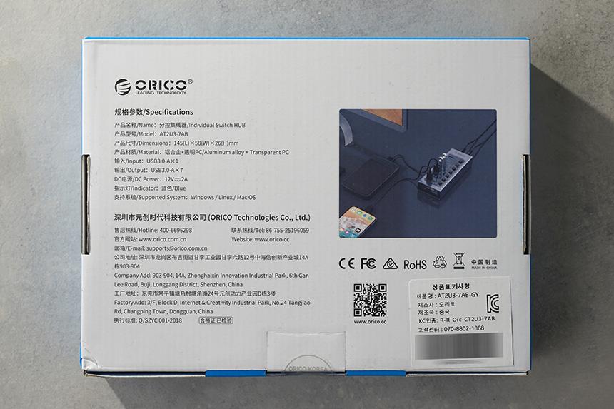 박스의 뒷면에는 오리코 AT2U3-7AB USB 3.0 유전원 허브의 스펙이 표시되어 있습니다. ORICO는 중국회사라서 영어와 함께 한자가 표시되어 있습니다. 이해하는데 어려움은 없을 것 같습니다.