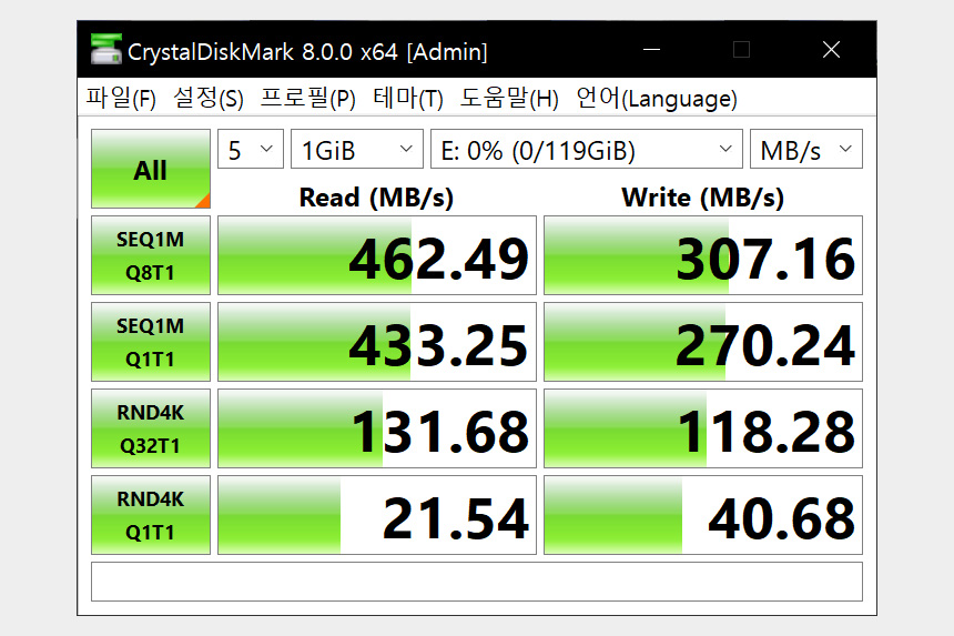 오리코 AT2U3-7AB USB 3.0 유전원 허브에 USB 3.0 외장하드를 연결해서 속도를 확인해보면 상당히 빠르다는 것을 확인할 수 있습니다. 속도는 정상적이라고 판단되었습니다.