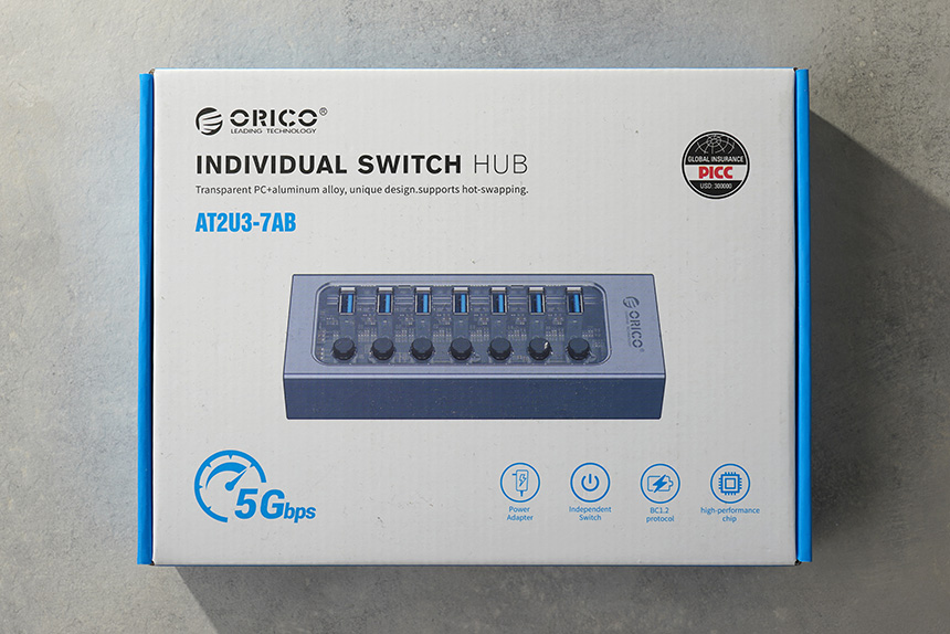 오리코 AT2U3-7AB USB 3.0 유전원 허브의 박스는 깔끔한 형태로 제작되었습니다. 그리고 전면에는 5Gbps 속도를 지원한다는 문구가 표시되어 있습니다.