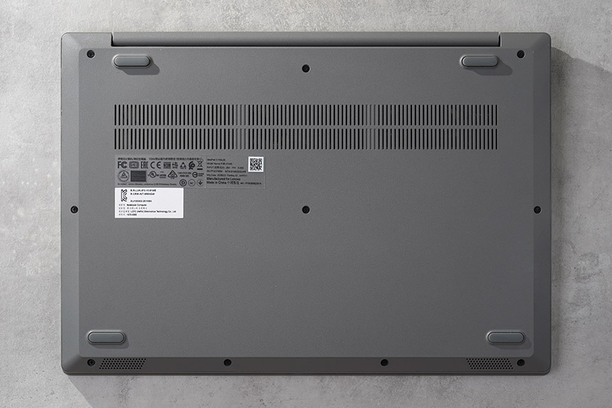 레노버 아이디어패드 슬림3 15IIL 5D의 바닥을 살펴보면 모서리 부분에 4개의 고무 지지대가 배치되어 있어서 잘 미끄러지지 않는 편입니다. 그리고 각진 형태의 디자인이 인상적이었습니다.
