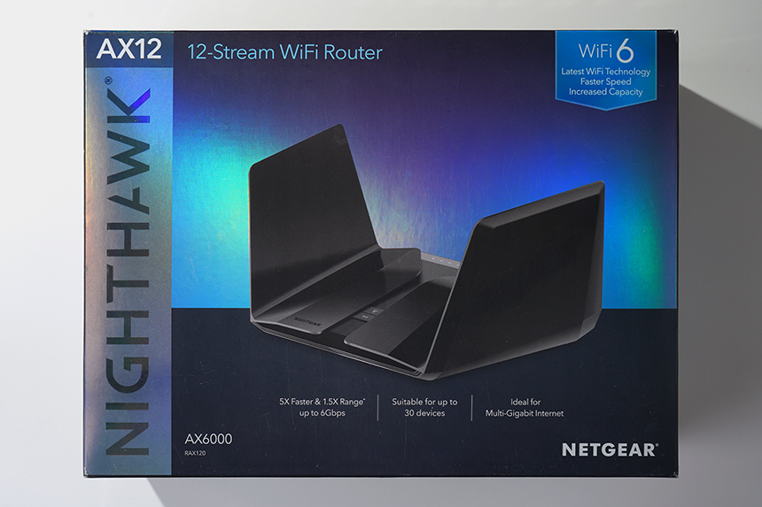 넷기어 RAX120 와이파이6 공유기의 박스는 세련된 형태로 제작되었습니다. 상단을 살펴보면 최신 규격의 WiFi6를 지원하는 제품이라는 문구가 표시되어 있습니다. 참고로 통합 속도는 6,000Mbps를 지원합니다.