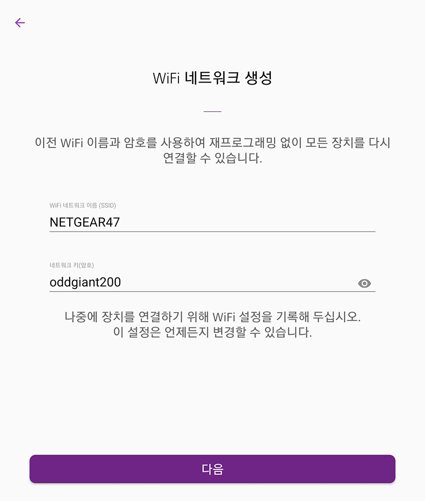 다음에는 와이파이 네트워크 이름과 키를 설정해주어야 합니다. 기본적인 세팅은 넷기어 RAX120 와이파이6 공유기에 부착된 스티커나 본체의 아래쪽에서 확인할 수 있고 자신이 암기하기 쉬운 내용으로 변경해주는 것이 좋을 것 같습니다.