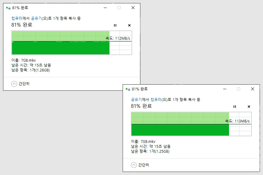 간이 NAS의 데이터 전송 속도를 확인해 보면 읽고 쓰기 속도가 112~113MB/s 정도가 측정되었습니다. 고성능 프로세서가 탑재되어서 그런지 전문적인 NAS와 같은 속도를 보여주었습니다.