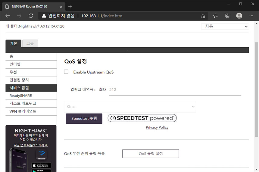 서비스 품질 메뉴에서는 QoS 기능을 켜고 끌 수 있습니다. 데이터의 중요도에 따라서 우선순위를 부여하는 기능입니다. 넷기어 RAX120 와이파이6 공유기의 접속된 장치들의 숫자가 많은 편이라면 활성화해보시는 것이 좋을 것 같습니다. 그런데 일반적인 가정환경에서 추천하지는 않습니다.