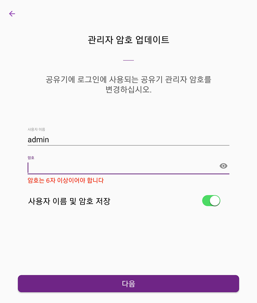 관리자 암호도 업데이트해주어야 합니다. 사용자 이름은 admin으로 고정되어 있고 패스워드는 내부 네트워크의 보안을 위해서 가능하면 어렵게 세팅을 하는 것이 좋을 것 같습니다.