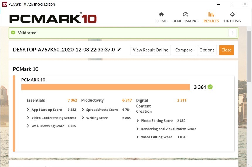 노트북의 전반적인 성능을 평가해주는 PCMARK10의 점수는 3361점으로 측정되었습니다. 인터넷 강의나 교육용으로 사용하기에 적합한 수준이라고 할 수 있습니다.