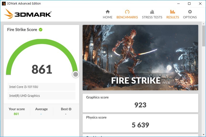 인텔 UHD 내장 그래픽카드의 3DMARK Fire Strike 점수는 861점으로 측정되었습니다. 가성비 노트북이라서 성능이 뛰어난 편이라고 이야기하기는 어려울 것 같습니다.