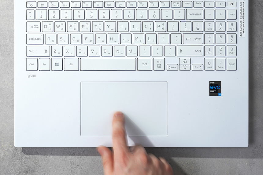 터치패드는 기존의 LG 그램 15(15Z90N) 대비 약 55% 넓어졌습니다. 그래서 편리한 사용성을 제공합니다. 그리고 글래스 코팅으로 마무리되어서 걸리적거리는 느낌 없이 부드럽게 손가락을 이동할 수 있습니다.