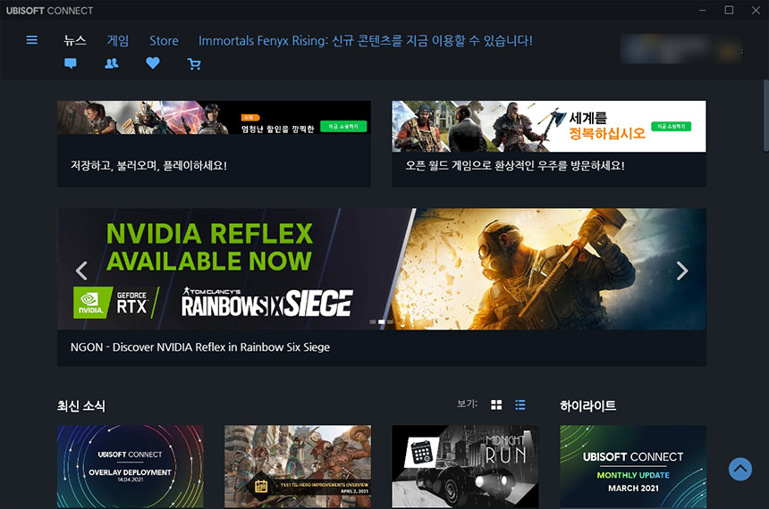 우선 UBISOFT CONNECT 런처에 접속을 하고 구매하고 싶은 게임을 검색해야 합니다. 저는 마침 할인을 하는 레인보우 식스 시즈를 벤치마크 목적으로 구매했습니다. 유비소프트에서는 자주 할인을 하므로 적절한 시점을 기다려 보시길 바랍니다.