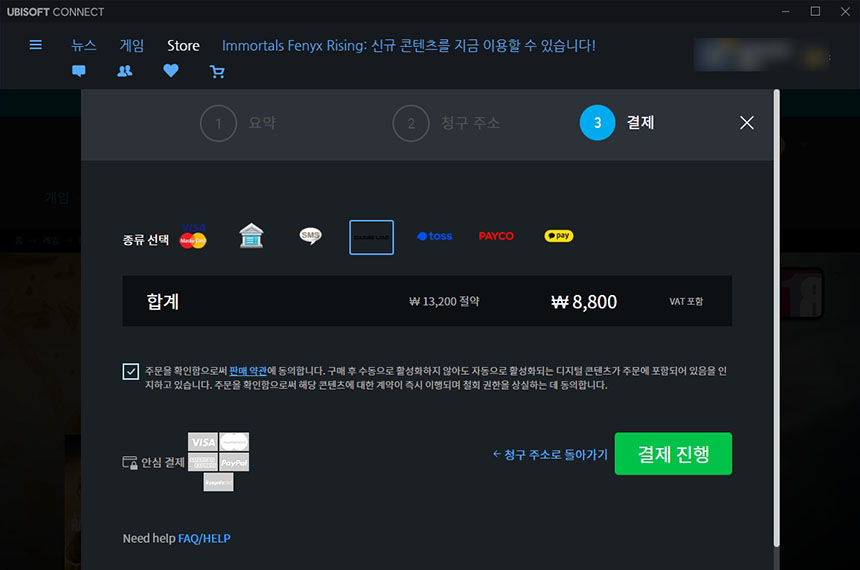 레인보우 식스 시즈의 평소 판매 가격은 22,000원이고 할인 가격은 8,800원입니다. 그리고 요약 메뉴의 아래쪽에 있는 결제 버튼을 누르면 본격적인 결제 과정이 진행됩니다.