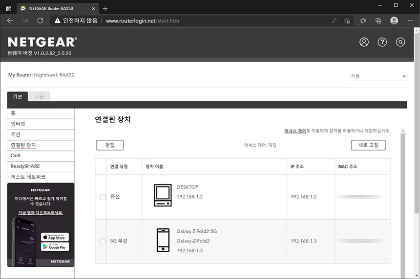 연결된 장치에서는 현재 넷기어 RAX50 공유기에 접속된 장치들의 리스트를 확인할 수 있습니다. 그리고 엑세스 제어 기능을 이용해서 연결된 장치들을 허용하거나 차단할 수 있다는 점이 편리한 부분입니다.