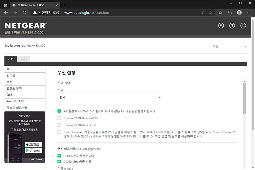 무선에서는 지역을 변경하거나 AX 활성화 그리고 스마트 커넥트와 같은 기능을 설정할 수 있습니다. 그리고 만약 속도가 제대로 나오지 않는다고 판단된다면 채널을 변경해 보시길 바랍니다.