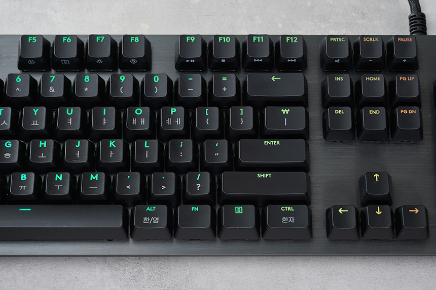 로지텍 G512 GX Red 키보드의 키캡은 정식 발매 제품이라서 당연히 한국어가 각인되어 있습니다. 그리고 코팅 처리가 되어 있어서 손가락으로 만지는 느낌이 나쁘지 않은 편이었습니다.