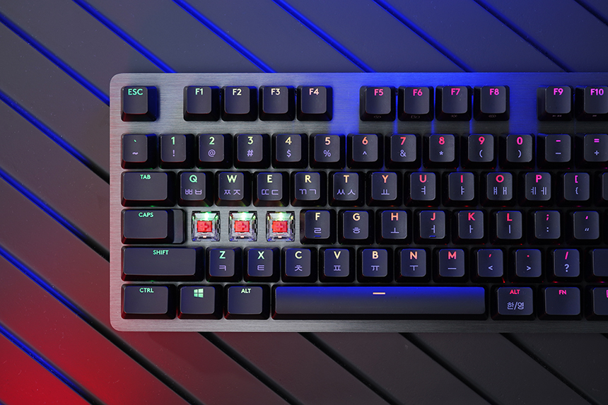 로지텍 G512 GX Red 키보드의 바디는 견고한 5052 알루미늄 마그네슘 합금으로 제작되었습니다. 특히 무광으로 마무리되었고 가로로 헤어라인이 들어가 있어서 상당히 세련된 느낌을 주는 편입니다.