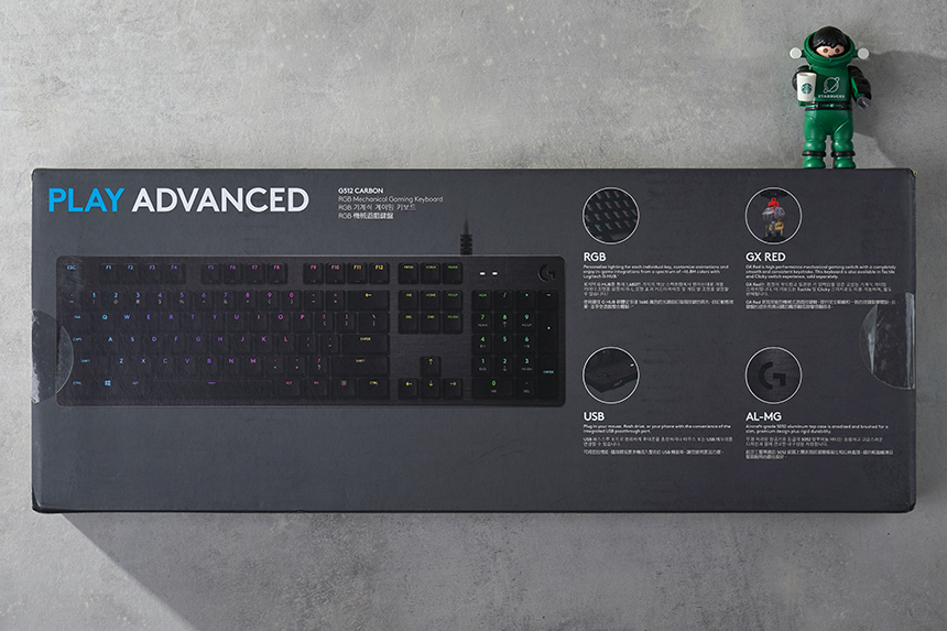 로지텍 G512 GX Red 키보드의 박스는 세련된 스타일로 제작되었습니다. 그리고 전면의 상단에는 G512 CARBON이라는 문구가 표시되어 있습니다. 참고로 스위치가 기존 Romer-G 축에서 GX 축으로 업그레이드된 제품입니다.