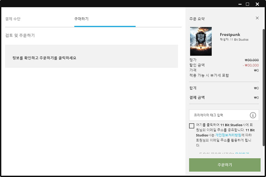 지금 구매를 선택하면 주문을 하는 페이지가 표시됩니다. 그리고 오른쪽 아래에 배치된 체크 박스를 선택하면 프로스트 펑크 제조사와 이메일을 공유합니다. 그리고 아마도 광고 메일이 올지도 모릅니다.