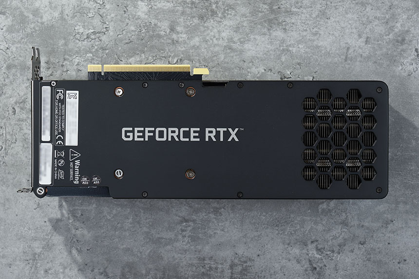 이엠텍 RTX 3080 Ti 블랙 에디션에는 다이 캐스팅 알루미늄 합금 백플레이트가 탑재되었습니다. 디자인이나 내구성 측면에서 장점이 있는 구조라고 할 수 있습니다. 그리고 발열을 줄여주기 위해서 벌집 구조가 적용되었습니다.