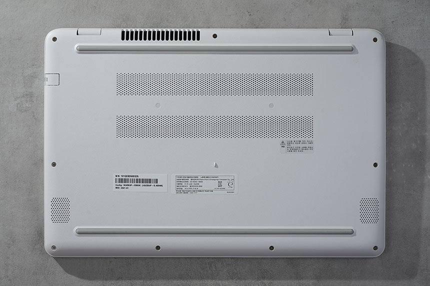 바닥을 살펴보면 위아래에 고무 지지대가 배치되어 있어서 책상 위에서 잘 미끄러지지 않습니다. 그리고 위쪽과 중간에는 온도를 낮춰주기 위한 통풍구가 배치되어 있습니다. 발열은 크게 신경 쓰이지 않았습니다.