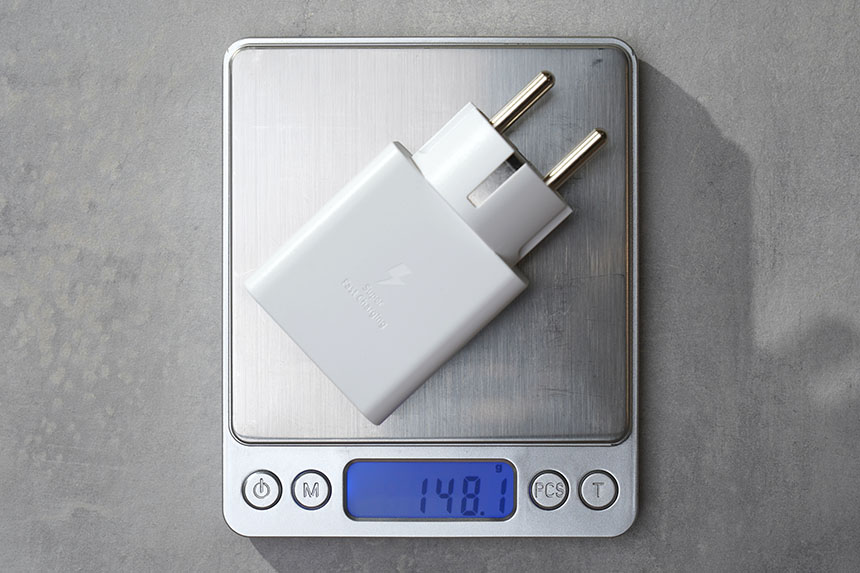 무게는 약 148g으로 측정되었습니다. 크기와 비교하면 약간 묵직한 느낌을 받을 수 있는 정도라고 할 수 있습니다. 참고로 65W 입출력은 최신 슬림 노트북들의 표준 규격이라고 할 수 있습니다.
