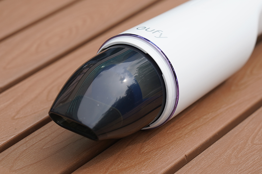 앤커 Eufy 홈백 H11 무선 핸디 청소기의 앞쪽에는 투명한 형태의 먼지함이 배치되어 있습니다. 검은색으로 제작되었기 때문에 먼지가 얼마나 있는지 확인할 수 있지만, 너무 적나라하지는 않다는 특징이 있습니다.