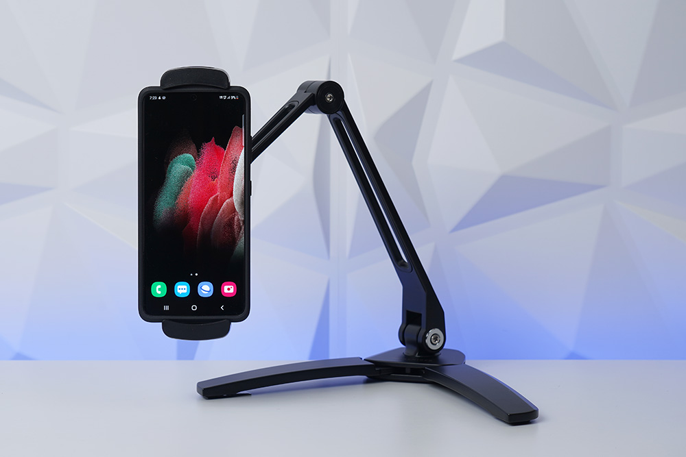 지니비 2단 거치대 GTS2에는 기본 클립형 헤드가 포함되어 있습니다. 좌우 집게는 스프링으로 고정되어 있고 13 ~ 22mm 크기의 스마트폰이나 태블릿을 고정할 수 있습니다.