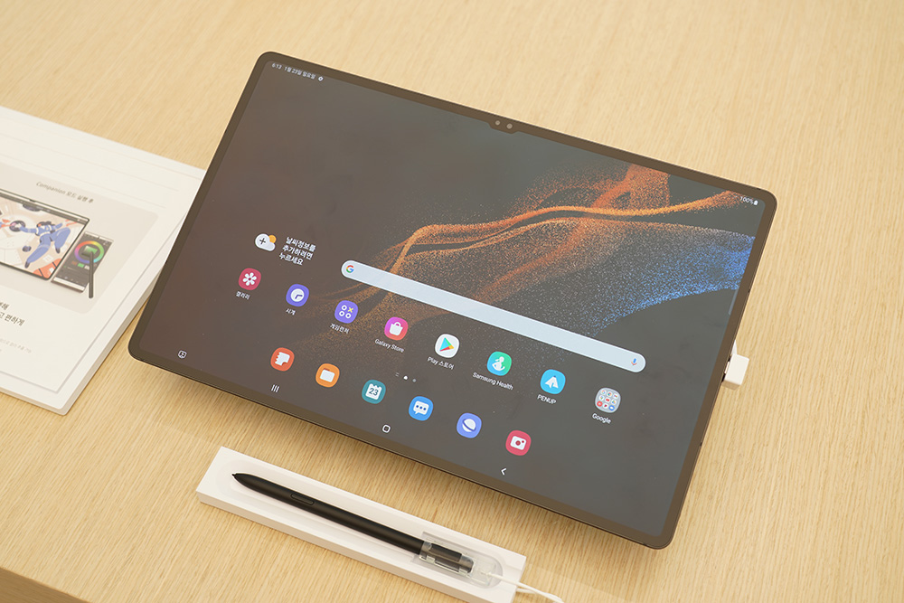 갤럭시 탭 S8 울트라에는 14.6인치 WQXGA+(2960 x 1848) 해상도의 슈퍼 AMOLED 디스플레이가 탑재되었고 120Hz를 지원합니다. 태블릿 중에서 크기가 가장 큰 편에 속한다고 할 수 있습니다.
