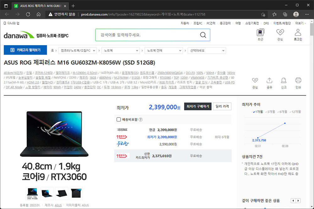그리고 최근에 출시되기 시작한 12세대 인텔 프로세서를 탑재한 게이밍 노트북을 찾는 분들에게는 ASUS ROG 제피러스가 적합할 것 같습니다. 그런데 출시된 지 오래되지 않아서 가격은 조금 비싼 편입니다.