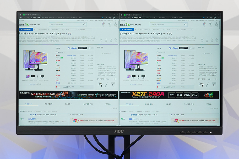 알파스캔 AOC Q24P2C USB-C 모니터의 베젤은 상당히 슬림한 편입니다. 그래서 콘텐츠에 대한 몰입감이 높은 것은 물론이고 좌우로 듀얼 혹은 트리플 모니터를 구성해서 사용하려는 분들에게 유용합니다.