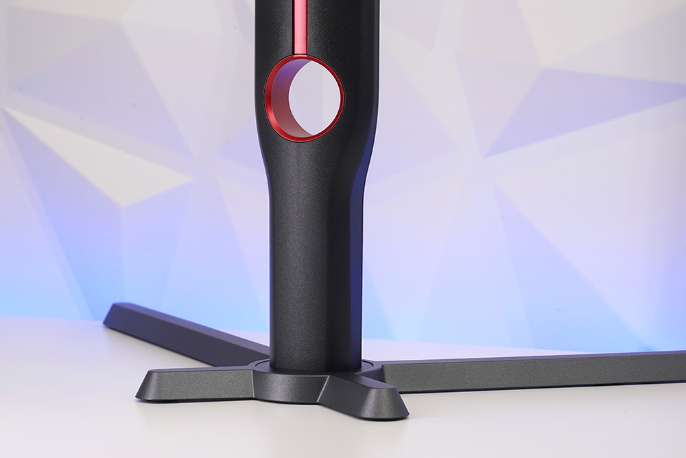 그리고 스탠드에는 전원과 영상 신호 케이블을 뒤쪽으로 정리해서 뺄 수 있는 홀이 준비되어 있습니다. 특히 레드 컬러의 포인트가 들어가 있다는 점이 인상적인 부분이었습니다.