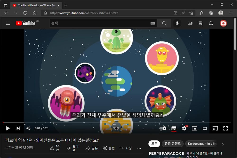 이제부터는 제가 인상 깊게 보았던 에피소드들을 추천해 보도록 하겠습니다. 가장 먼저 “페르미 역설 1편 - 외계인들은 모두 어디에 있는걸까요?”입니다. 총 2편으로 구성되어 있고 관측 가능한 우주에서 과연 우리 인류 혼자만 존재할까? 에 대한 내용들로 구성되어 있습니다.