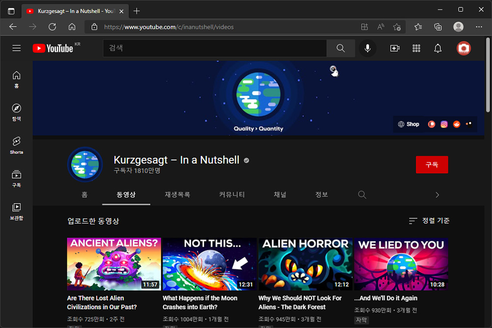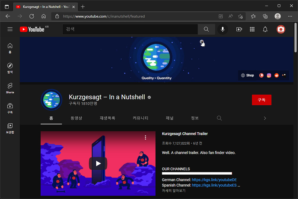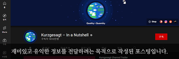 쿠르츠게작트(Kurzgesagt)의 채널은 아래의 링크를 통해서 확인할 수 있는데요. 대부분의 내용은 과학에 기반을 두고 있고 제작 관심이 많은 우주에 관련된 내용도 많은 편입니다. 그리고 독일인들에 의해서 제작되고 있지만, 영문으로 해설이 나오고 한국어 자막도 대부분(일부는 제외) 지원하기 때문에 어렵지 않게 시청할 수 있습니다.
