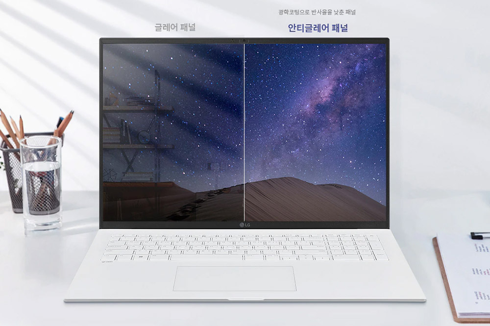 그리고 LG 그램 2022에는 드디어 안티글래어 패널이 탑재되었습니다. 그동안 많은 사용자가 원했던 기능인데 이제야 탑재되었습니다. 그래서 눈부심이 적은 편이고 야외에서도 크게 불편하지 않게 사용할 수 있을 것으로 예상합니다.