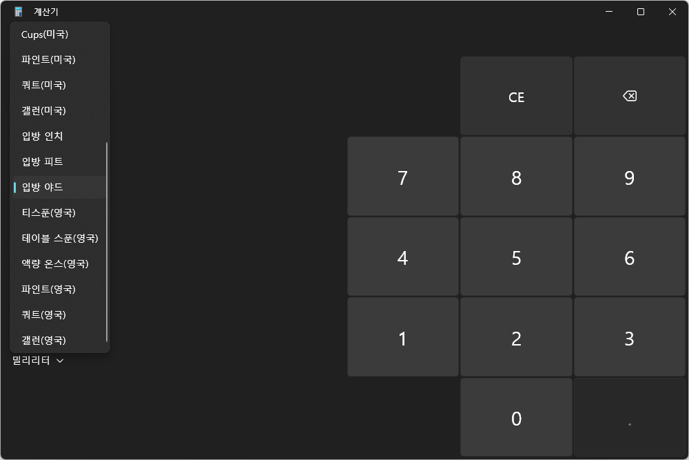 윈도우11 계산기의 편리한 기능 중의 하나는 변환기를 탑재했다는 점입니다. 환율과 부피, 길이, 무게 및 질량, 온도, 에너지, 면적, 속도, 시간, 일률, 데이터, 압력, 각도로 구성되어 있습니다.