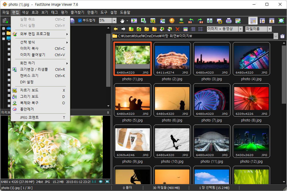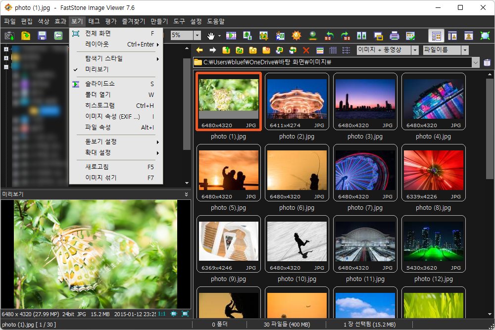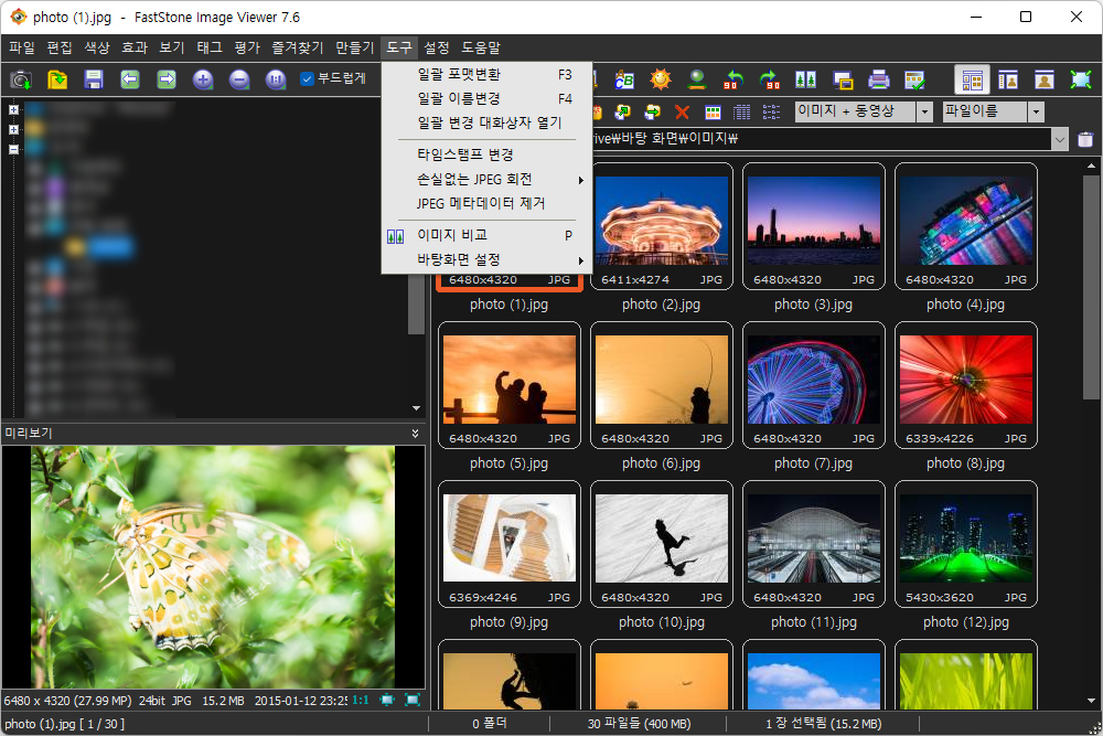 패스트스톤(FastStone) 이미지 뷰어의 기능들을 살펴보면 파일에서는 따로 저장하거나 다시 부르기와 같은 기능들이 준비되어 있습니다. 그리고 한국어를 완벽하게 지원하기 때문에 어렵지 않게 사용할 수 있습니다.