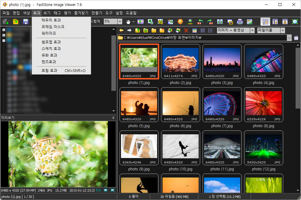 효과에서는 프레임 마스크와 워터마크와 그리고 스케치 효과와 유화 효과들을 실행시킬 수 있습니다. 잘 못 사용하면 사진이 조금 촌스러워보일 수 있으니 상황에 맞춰서 활용해 주시길 바랍니다.