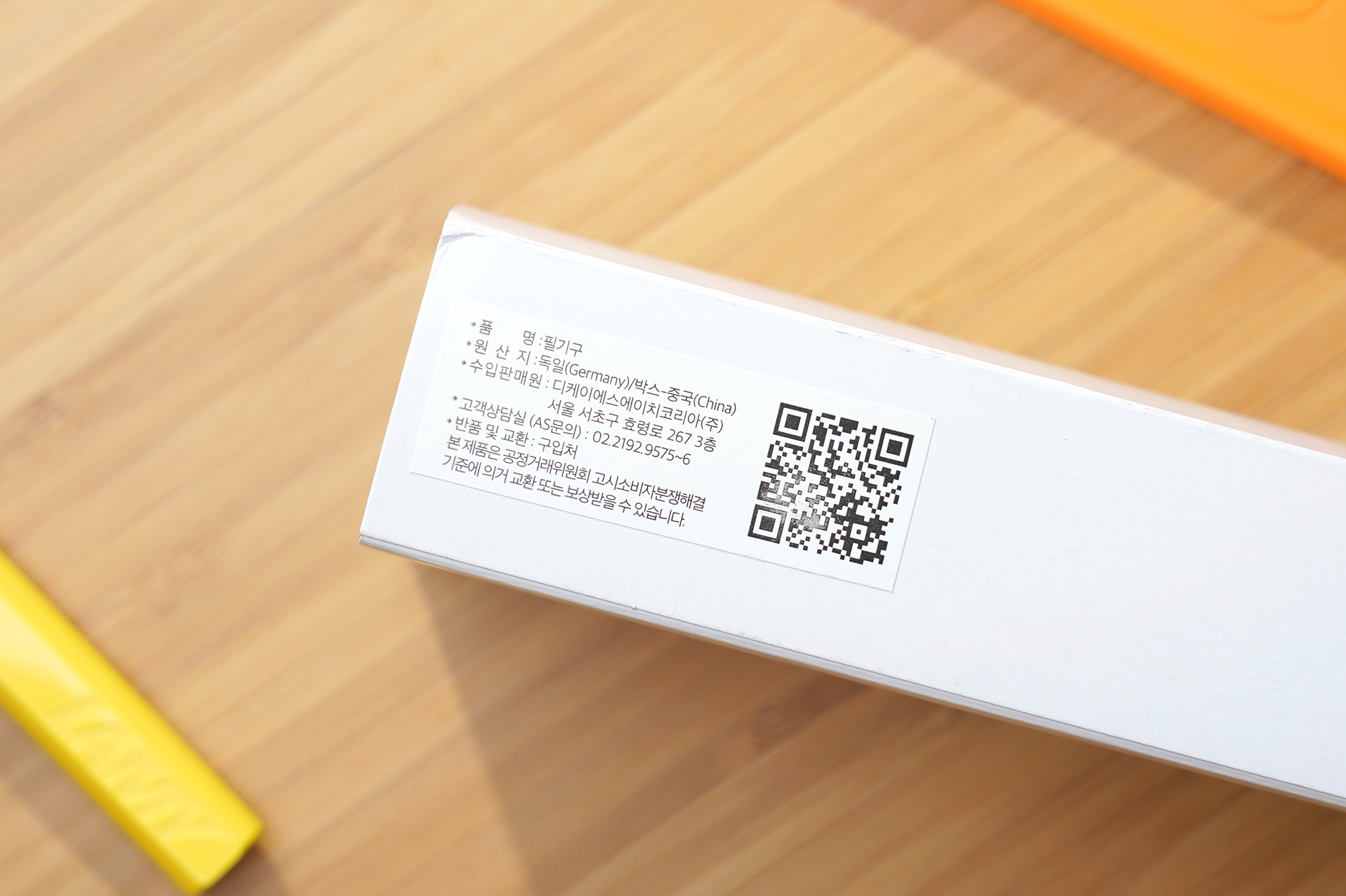 라미 2000 마크롤론 만년필의 겉박스는 심플한 느낌으로 제작되었습니다. 그리고 옆면을 살펴보면 제품 자체는 독일에서 제작되었고 박스는 중국에서 제조되었다는 문구가 표시되어 있습니다. 그리고 디케이에스에이치코리아에서 수입한 제품이라는 것을 확인할 수 있습니다. AS를 문의할 수 있는 고객상담실의 전화번호는 02-2192-9575~6입니다. 직구로 구매할 때는 사후관리를 받을 수 없으므로 잘 판단해야 합니다.