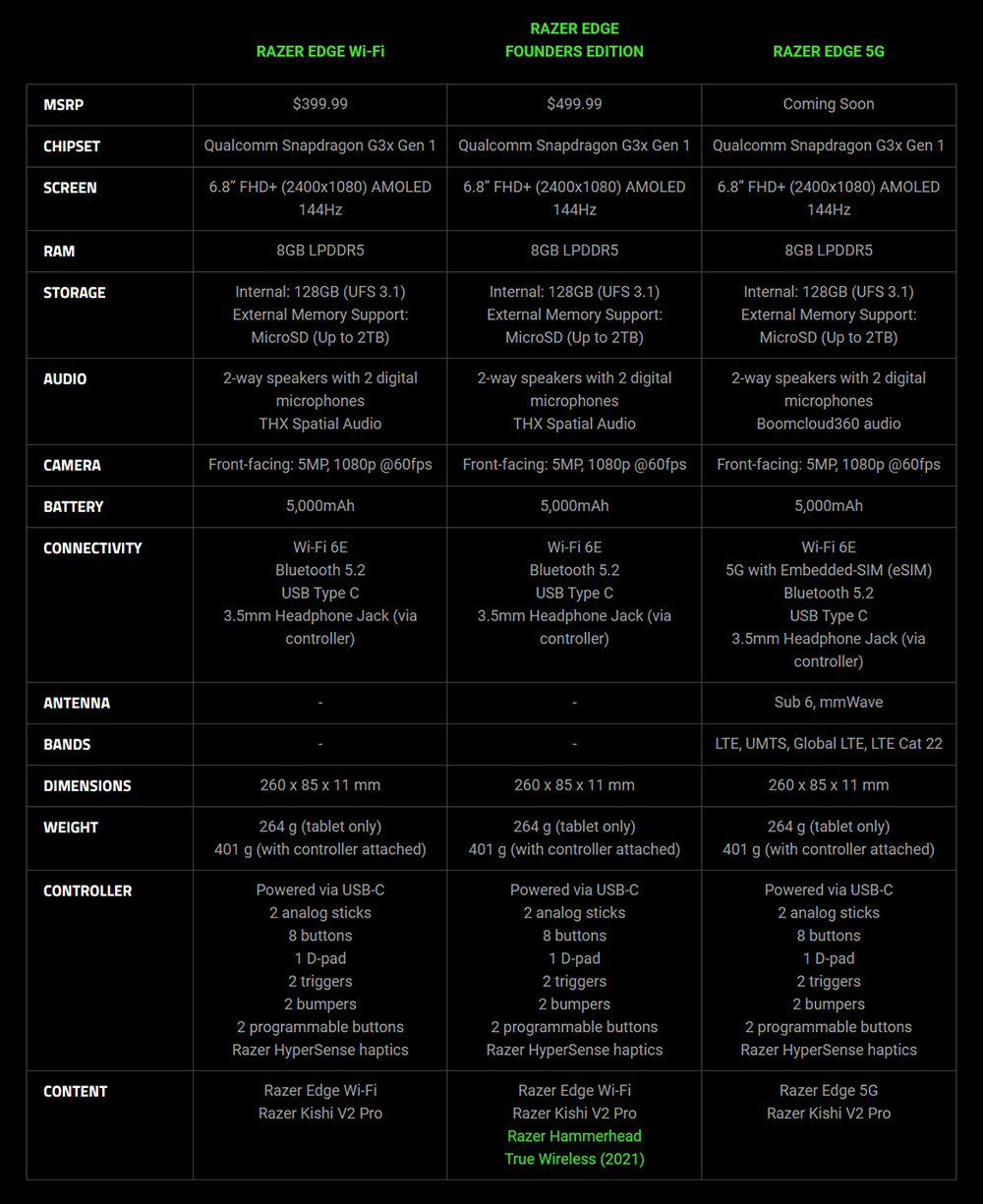 레이저 RAZER EDGE는 3가지 모델로 출시되었습니다. 기본 모델은 $399.99(약 57만원)이고 Razer Hammerhead True Wireless 블루투스 이어폰이 포함된 버전은 $499.99(약 71만원) 그리고 레이저 RAZER EDGE 5G 모델의 가격은 아직 공개되지 않았습니다.