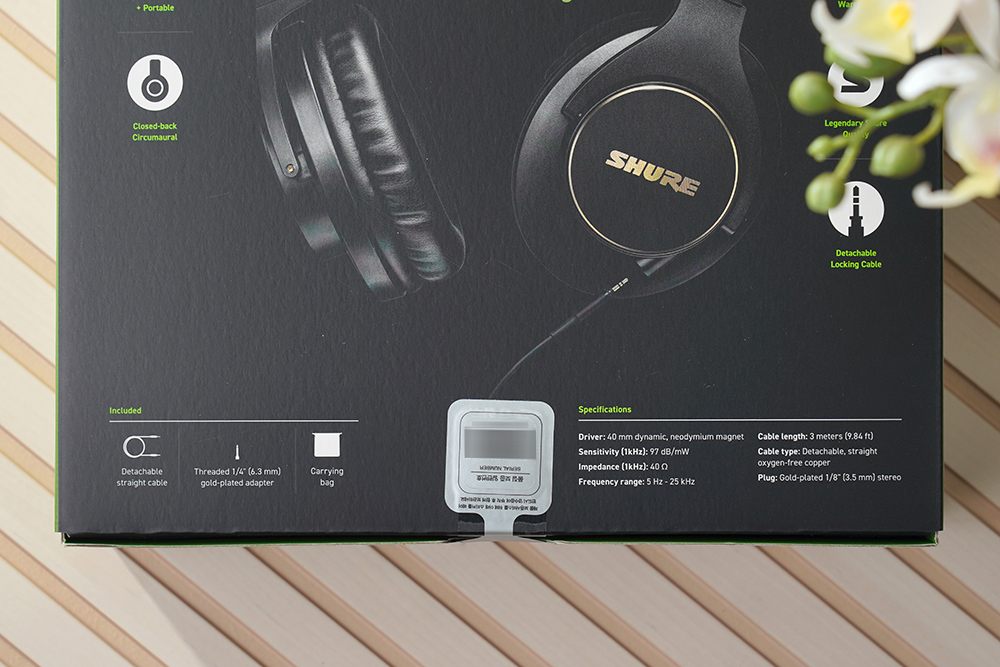 슈어 SRH840A 모니터링 헤드폰의 스펙을 40mm 다이나믹 드라이버가 탑재되었고 주파수 대역은 5~25,000Hz 그리고 임피던스는 40ohm입니다. 그리고 박스의 뒤쪽에 삼아사운드의 보증 스티커가 부착되어 있습니다.