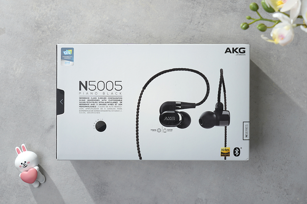 AKG N5005 하이엔드 이어폰의 박스는 세련된 스타일로 디자인되었습니다. 그리고 전면에는 하이 레졸루션 오디오(Hi-Res AUDIO)와 블루투스 기능을 탑재했다는 문구가 인쇄되어 있습니다. 참고로 블루투스 기능 때문에 $150 이상에서는 목록통관 대상에 해당하지 않고 관세 혹은 부가세가 청구되어서 가격이 더 비싸졌습니다.
