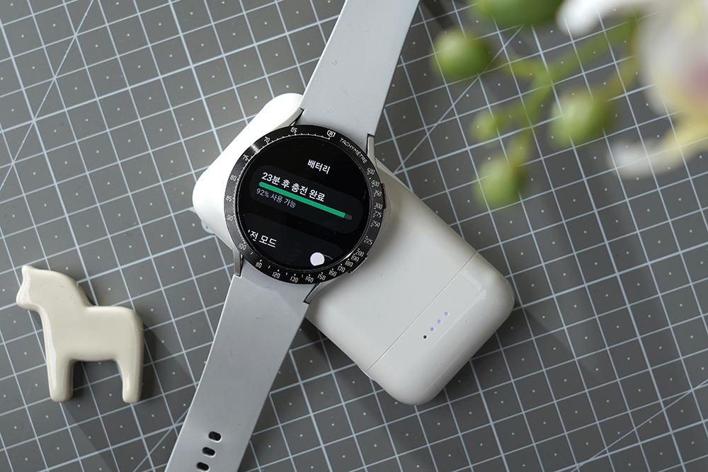 잇버스 워치밥 IBT-WC005 보조배터리는 2.5W 정도의 전력으로 갤럭시워치를 충전할 수 있습니다. 그래서 갤럭시워치4 44mm의 충전 시간을 확인해 보면 약 1시간 정도 만에 50%에서 92% 정도까지 충전할 수 있었습니다. 그리고 갤럭시워치에서 제공하는 예상 충전 시간도 생각보다 정확한 편이었습니다.