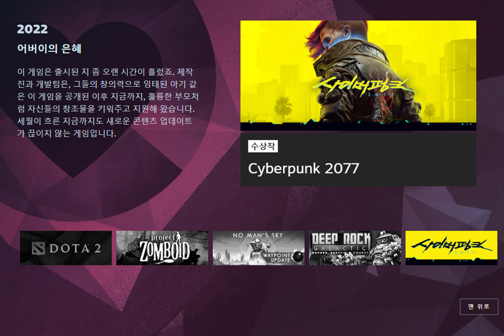 2022 어버이의 은혜는 CD PROJEKT의 사이버펑크 2077 (Cyberpunk 2077)이 선정되었습니다. 출시 초기만 하더라고 버그와 구현되지 못한 부분 때문에 엄청난 악평이 쏟아졌지만, 넷플릭스의 사이버펑크: 엣지러너가 방영되고 버그가 잡히면서 재평가가 이루어지고 있습니다.