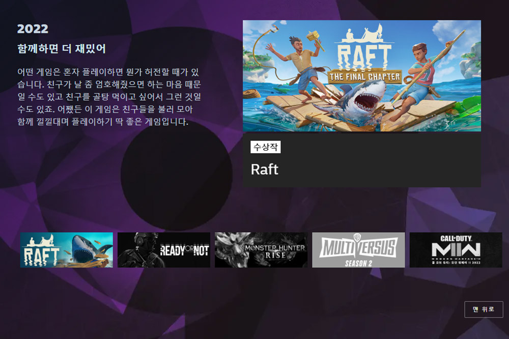 2022 함께하면 더 재밌어는 Redbeet Interactive의 Raft라는 게임이 차지했습니다. 생존 어드펜처 게임으로 스트리머들 사이에서 입소문이 나면서 인기를 끌기 시작했고 독특한 게임성을 가지고 있다는 특징이 있습니다.