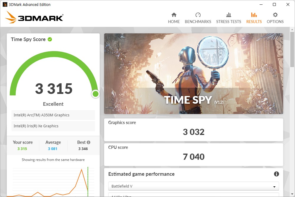 그리고 삼성전자 갤럭시북2 프로에는 인텔® Arc™ A350M 외장 그래픽카드가 탑재되었습니다. 그래서 내장 그래픽카드를 탑재한 제품과 비교해서 나은 성능을 보여줍니다. 3DMARK를 이용해서 성능을 확인해 보면 파이어 스트라이크(Fire Strike) 점수는 7000점, 타임 스파이(Time Spy)는 3315점으로 측정되었습니다.